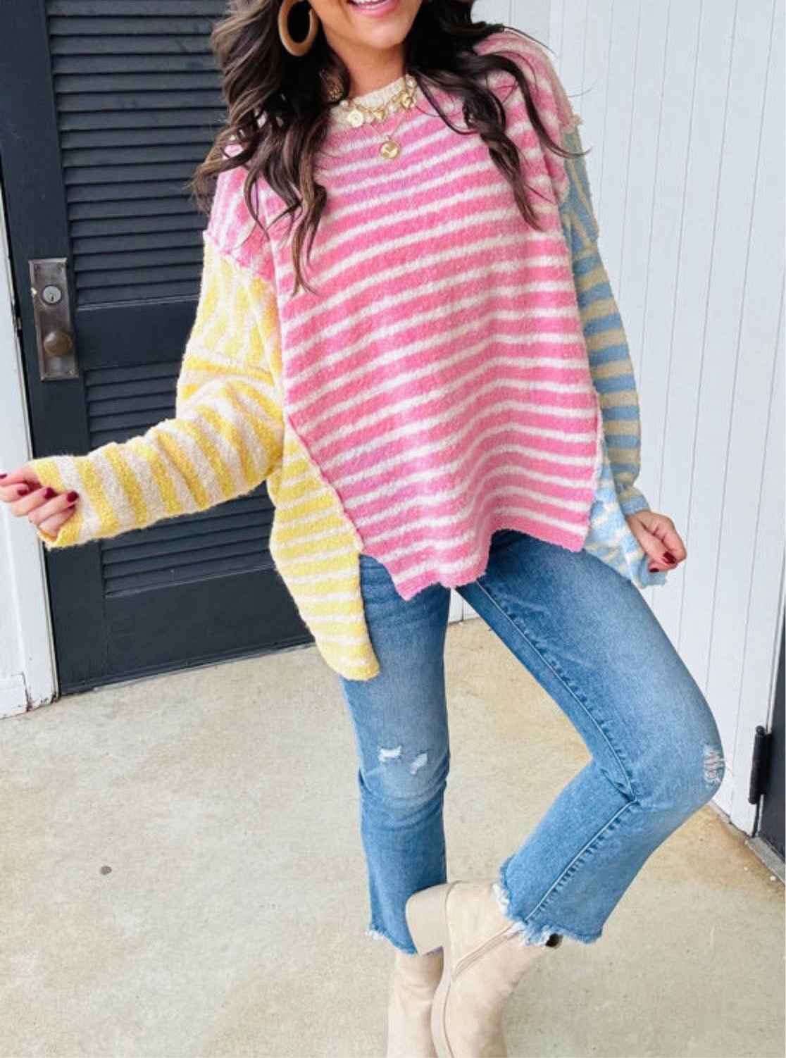 Stay cozy in style with BRIGHT DAYS AHEAD Multicolour Color Block Striped Patchwork Dolman Sleeve Slit Sweater. This modern sweater features a unique design and dolman sleeves for a comfortable fit. Perfect for adding a pop of color to your wardrobe and keeping you warm on chilly days.