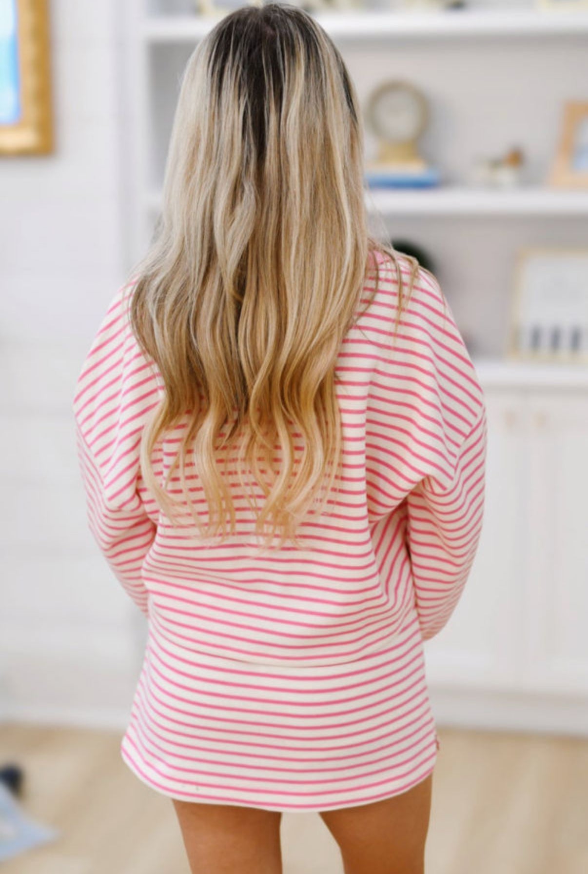 This COTTON CANDY SET is a playful and stylish outfit that features a pink stripe collared v-neck pullover and matching skort. The drop shoulder design adds a touch of elegance, while the cotton fabric ensures comfort. Perfect for a chic and effortless look.