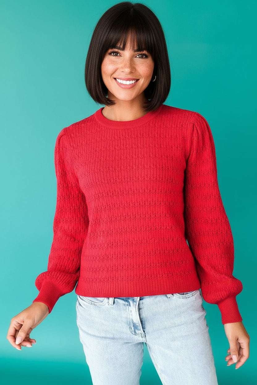 "Turn up the heat with CRIMSON KISS, the fiery red sweater that will keep you stylish and snug. Its trendy pattern and knit ribbed cuffs add a touch of edge to the classic crew neck design. Perfect for a bold and playful look. (Warning: may cause excessive compliments!)"