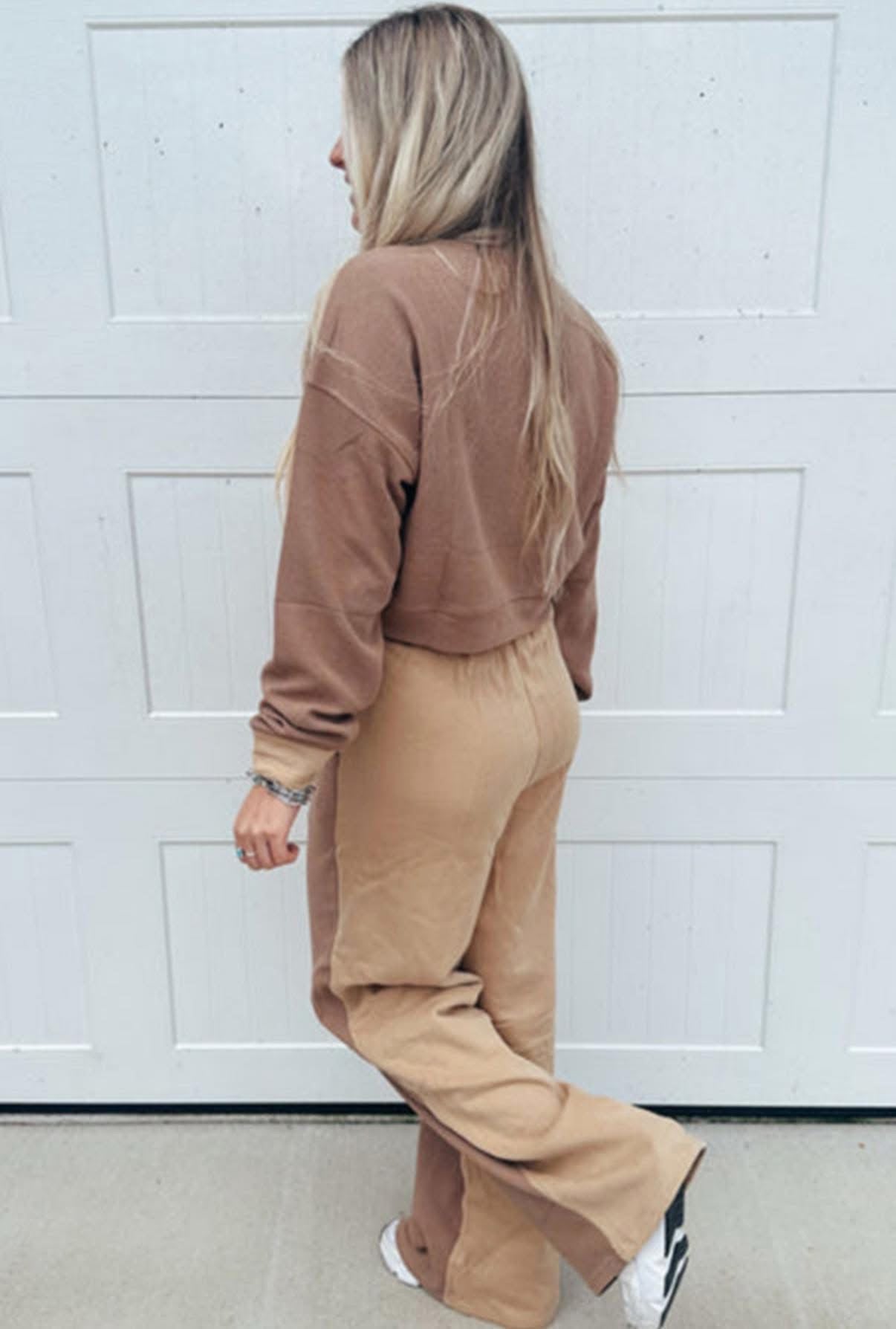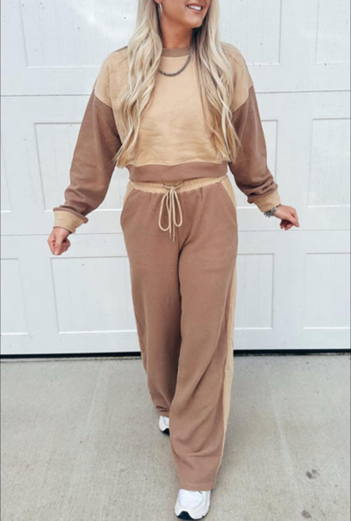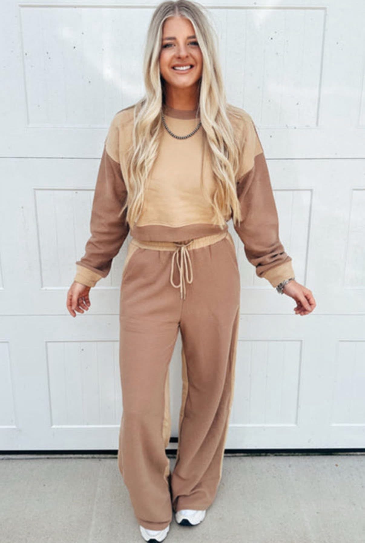 Upgrade your lounge game with the ESPRESSO HOUR SET. Featuring a chic khaki color block design and comfortable long sleeve crop top, this set is perfect for both casual and stylish occasions. The drawstring pant ensures a custom fit for ultimate comfort. Elevate your wardrobe with this must-have set.