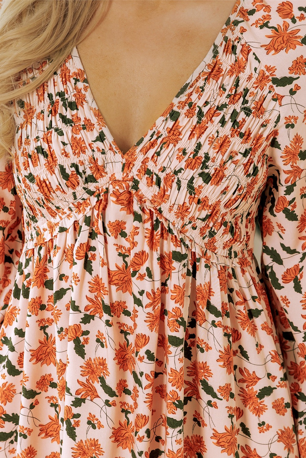 Expertly designed for the modern woman, the EVERYDAY AUTUMN dress features a charming deep V neck and smocked bust to accentuate your curves. The beige floral print adds a touch of femininity while the bubble sleeves add a playful element. Perfect for all-day wear, this babydoll dress will make you feel confident and stylish.