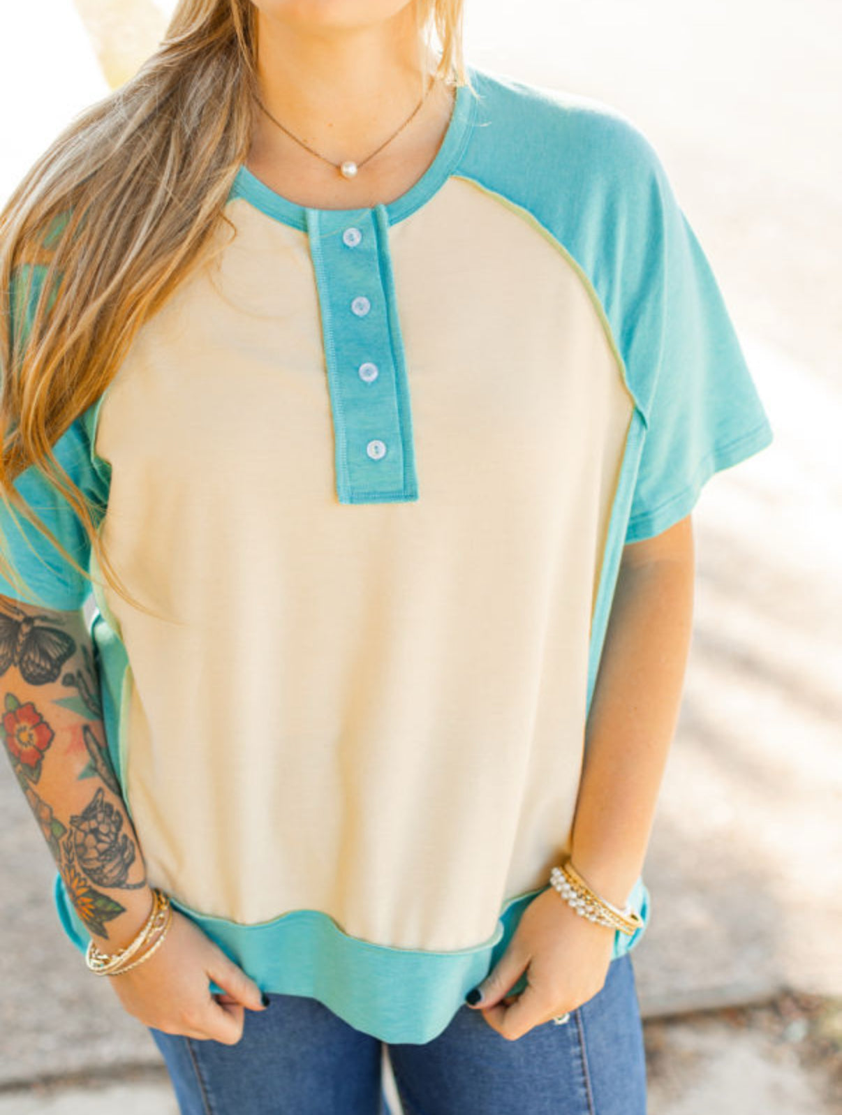 The EVERYDAY EASE tee shirt features a stylish raglan sleeve and button Henley design, perfect for plus size and curvy individuals. Feel comfortable and confident while looking your best.