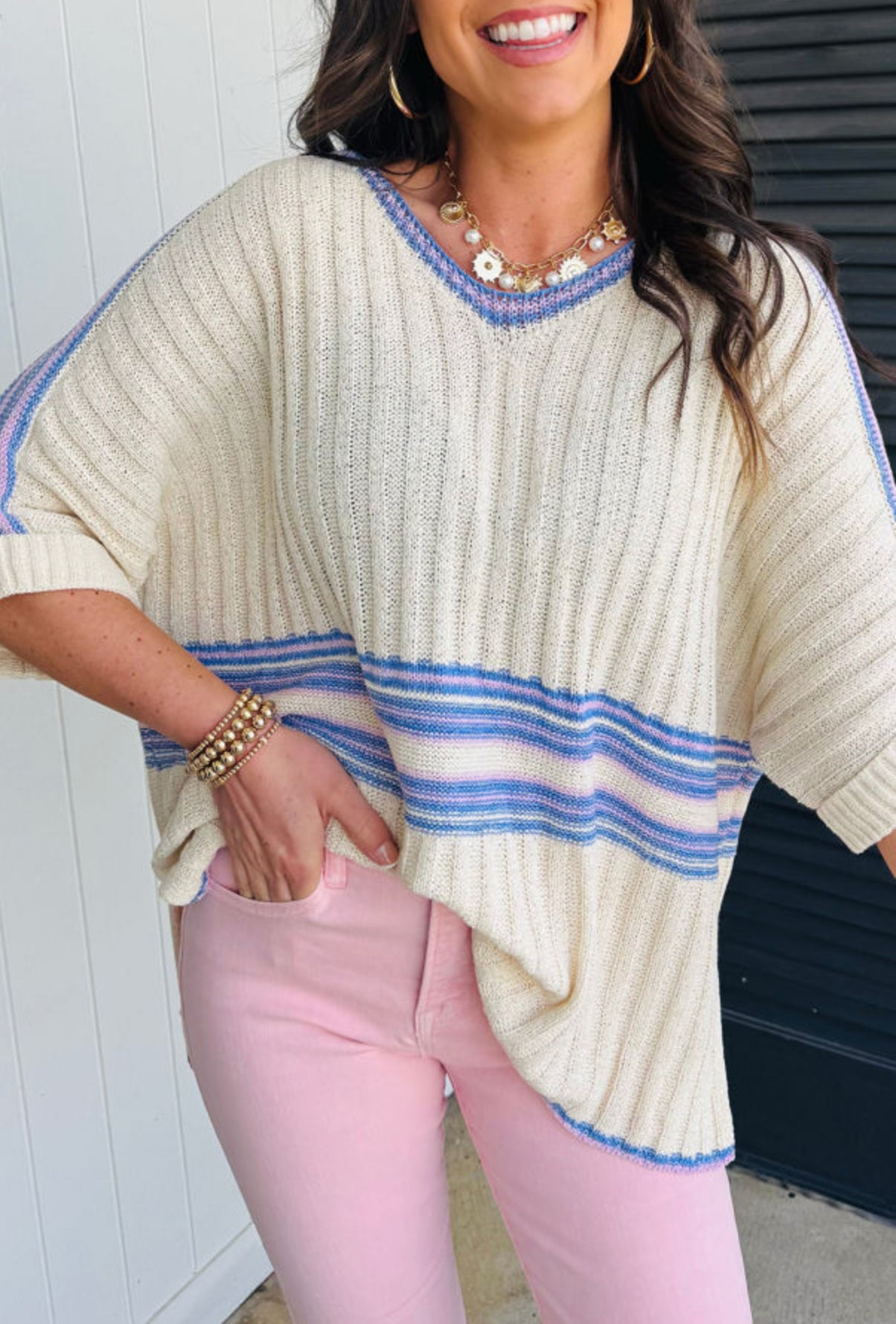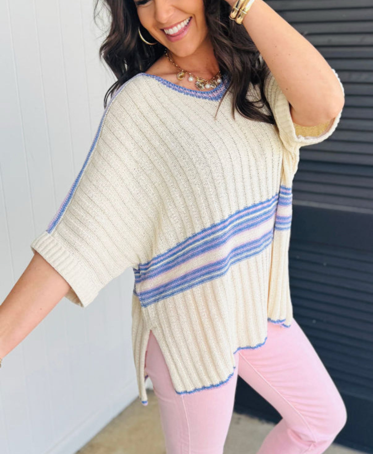 Expertly designed, HARBOR HAZE combines comfort and style with its White Striped V Neck Dolman Sleeve Rib Knit Oversized Sweater with Slits. This statement piece is perfect for any occasion, providing a flattering fit and a cozy feel. Upgrade your wardrobe with this must-have item.