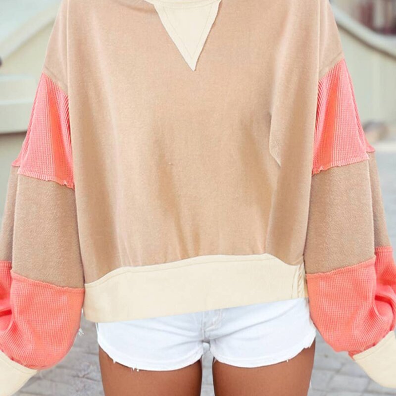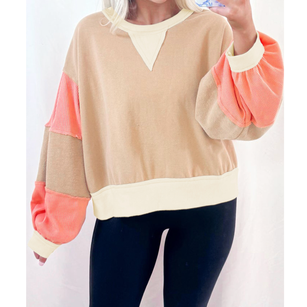 Get your style blooming with SUNRISE SANDS! This pullover sweatshirt features a light French beige color block design with textured patchwork details. Stay cozy and stylish with this unique and playful addition to your wardrobe.