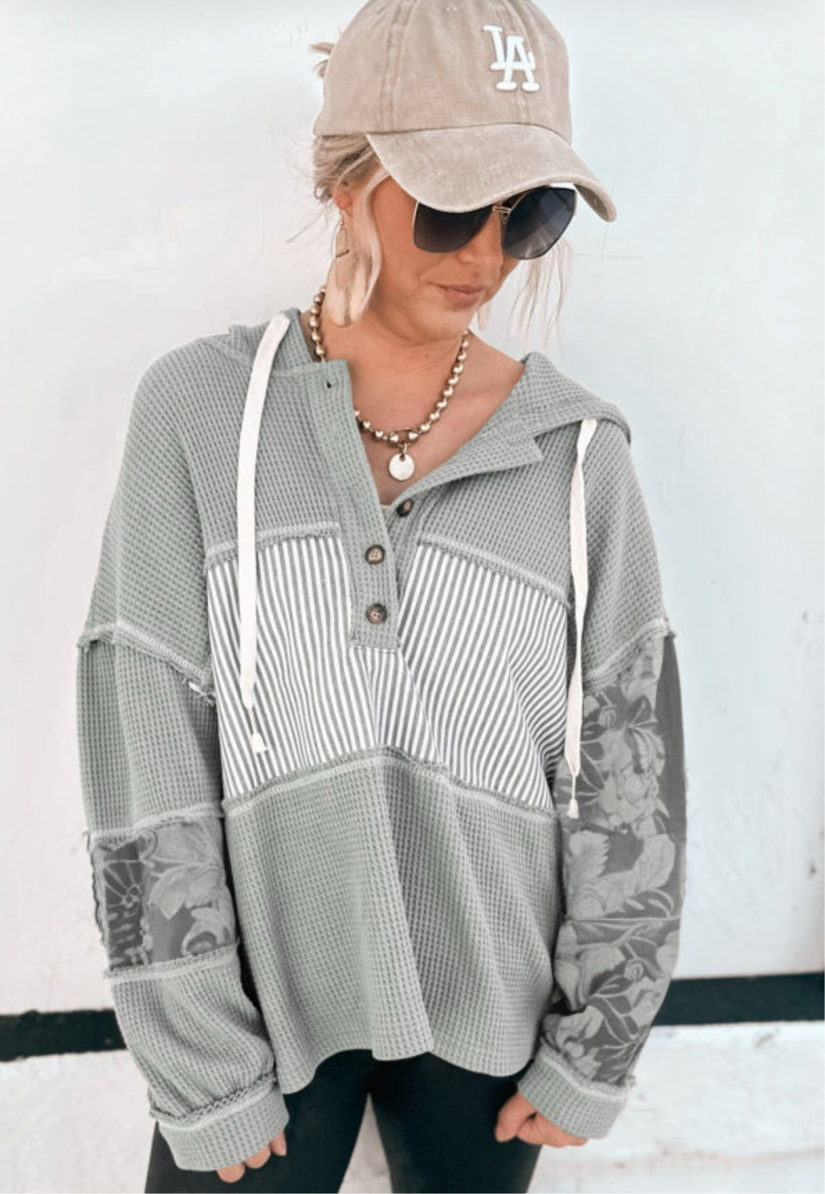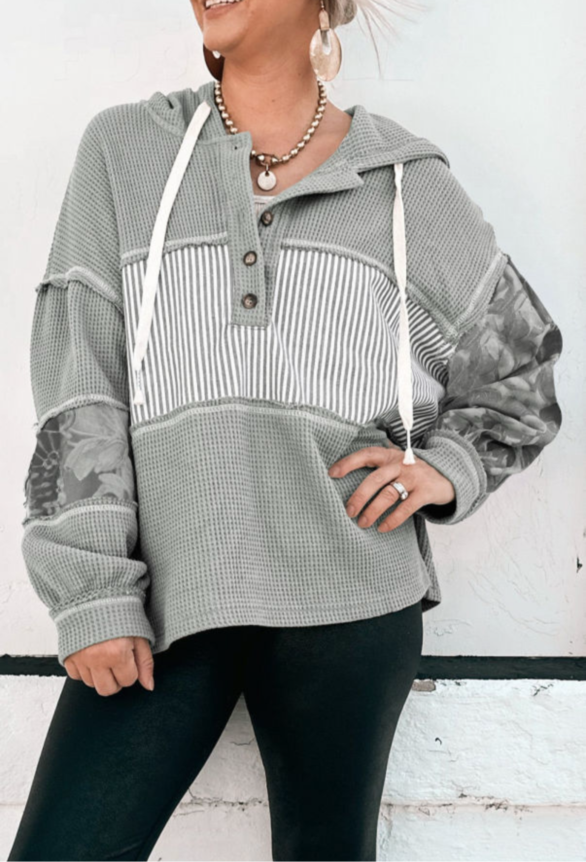 Introducing THE CHARLOTTE, a stylishly versatile top that features a drawstring C hood and long sleeves for added warmth. Its Gray Waffle Printed Patchwork design adds a touch of texture to any outfit. Stay comfortable and trendy with this must-have addition to your wardrobe.