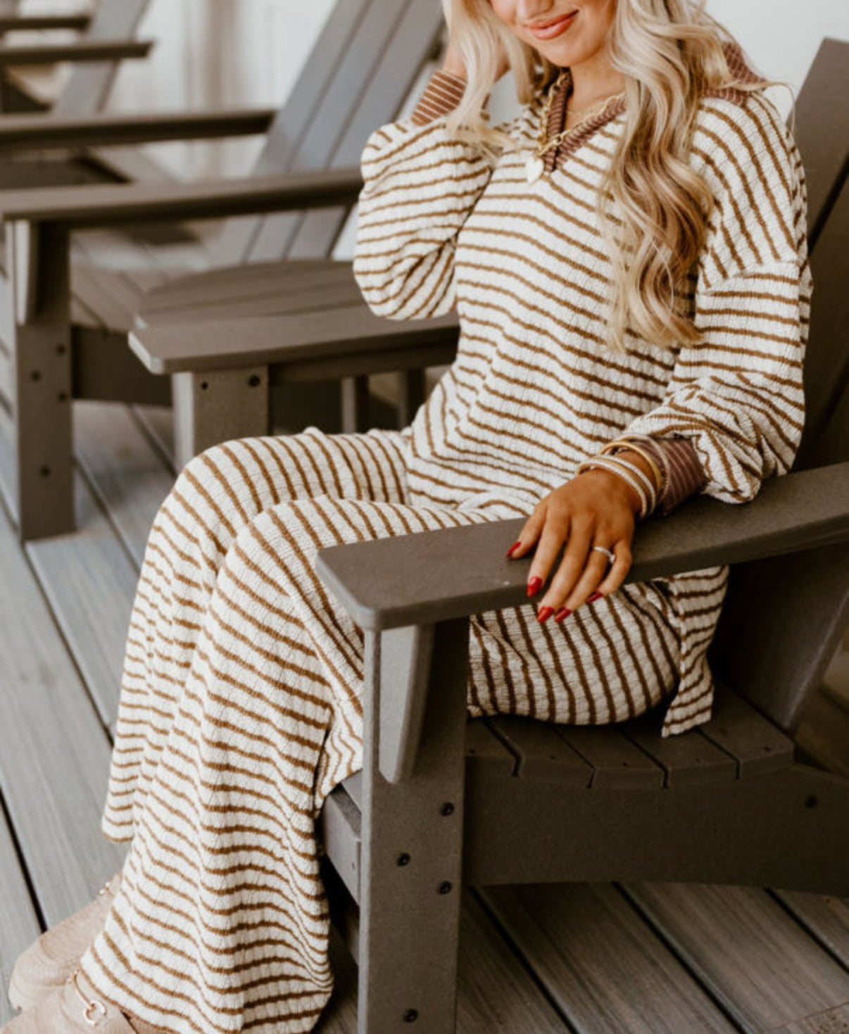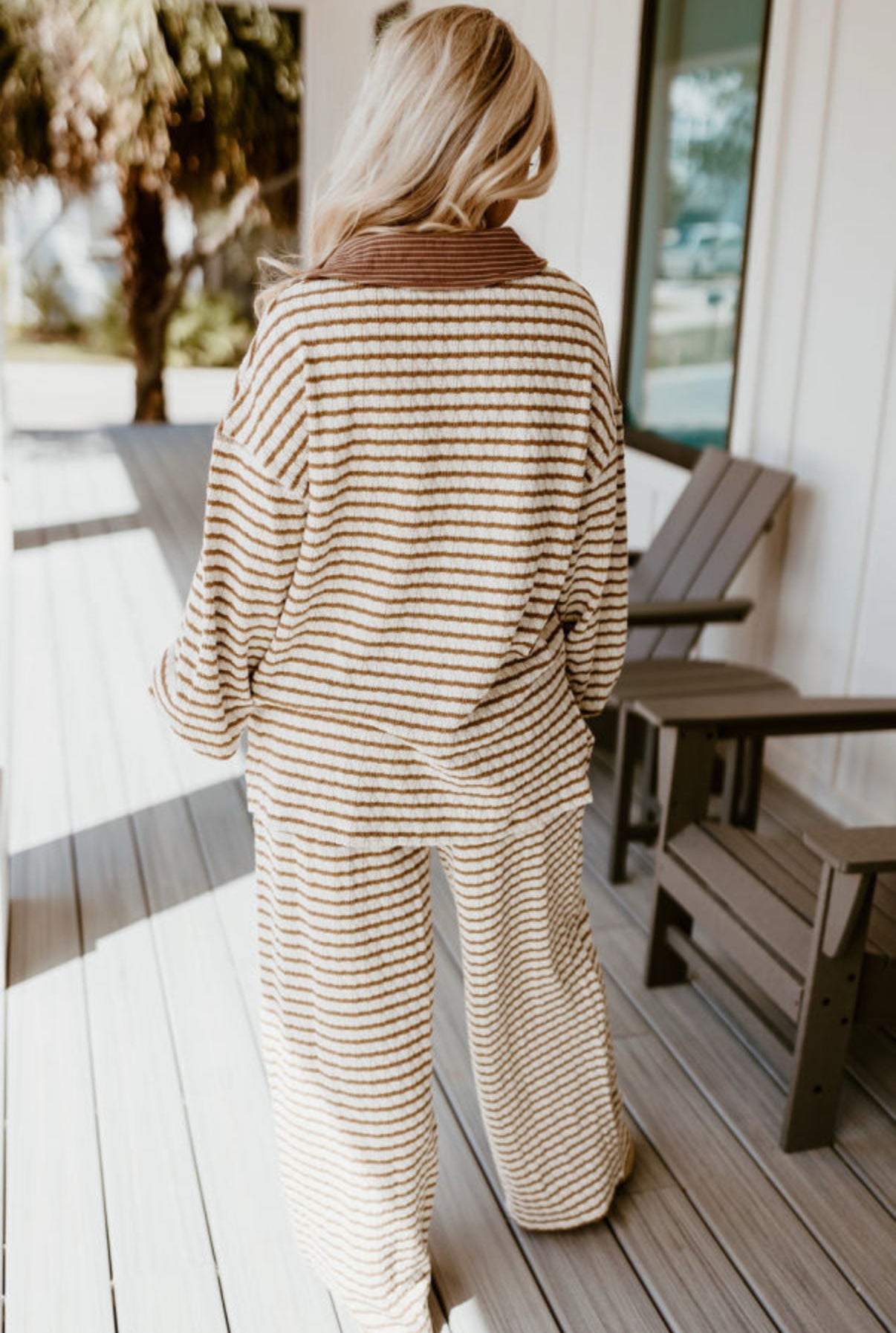 This Khaki Stripe Collared Pullover Top and Drawstring Pant Set offers both style and comfort. The collared top and drawstring pants allow for a versatile look and an adjustable fit. Made with high-quality materials, this set is perfect for any occasion.
