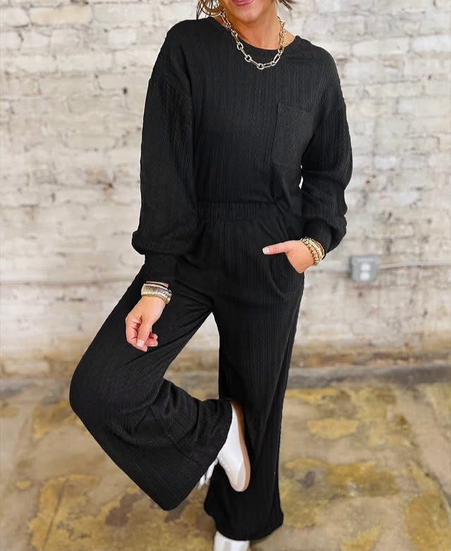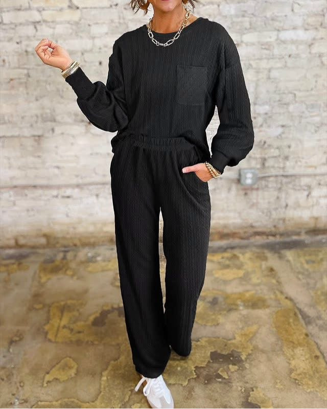 Kick your style up a notch with The Signature Set. This black textured pants set features a long-sleeved top with a chest pocket for functional flair. Be the epitome of cool and show off your unique fashion sense.
