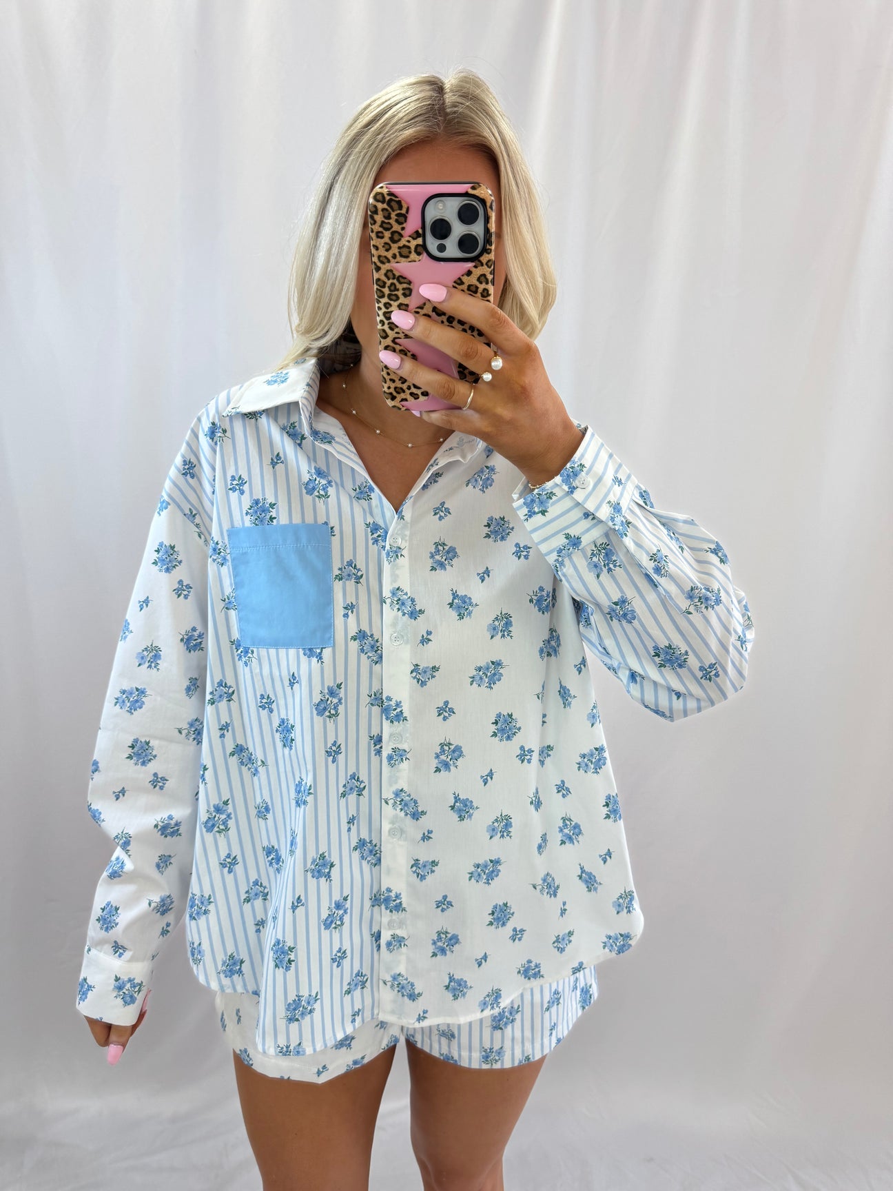 "Add some flower power to your wardrobe with the TELL ME MORE button down. This blue floral set collar top will have you looking fresh and stylish (no green thumb required). Perfect for any occasion, from brunch to a night out!"