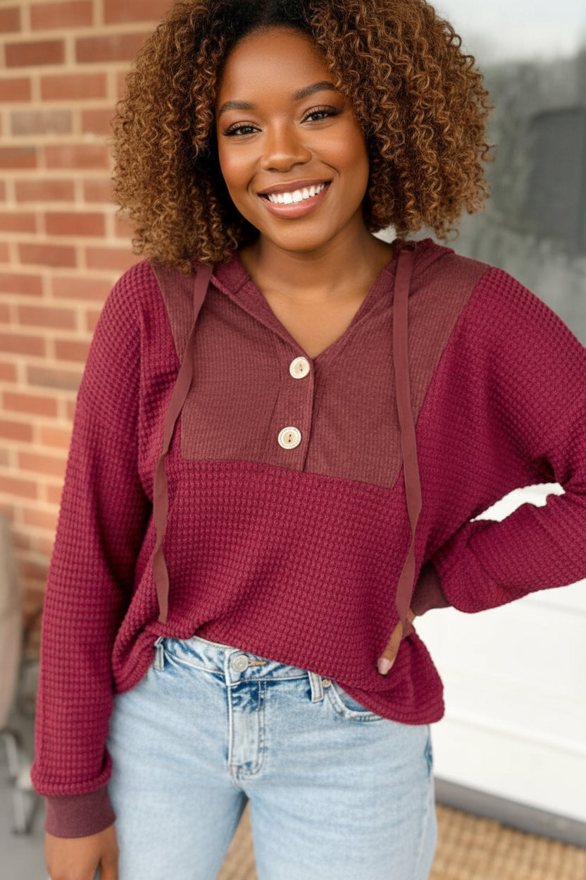 Introducing WAFFLE & WREN - the perfect top for those who like their fashion with a side of FUN! This patchwork drop shoulder top not only keeps you stylish, but also features a cozy hood and long sleeves for added comfort. Waffle on, fashion lovers!